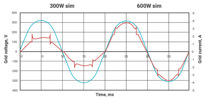 模拟和测量之间的完美吻合如图 3-2 所示。在 600W 的满载条件下测得的总谐波失真仅为 2.6%,远低于并网微型逆变器 3% 的要求。