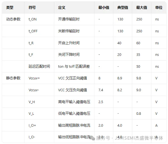 出色的动态性能:芯片的开通传输延时 t_ON 和关断传输延时 t_OFF 均为 130ns,这一极短的传输延时使得功率器件的开关动作能够更加精准地控制。同时,其开启上升时间 t_R 和关闭下降时间 t_F 也表现优异,分别为 40ns 和 20ns(典型值),能够有效减少功率器件在开关过程中的损耗,提高系统的稳定性和可靠性。
