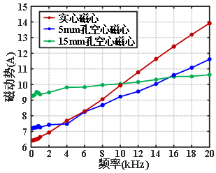 在磁通幅值维持约为0.00018Wb的情况下,从20Hz到20kHz逐渐改变磁通频率,所测试到不同磁心的实验结果如附图3所示。在较低的磁路频率下,磁通分布较为均匀。然而,由于开孔的磁心中心存在孔洞,导致磁通的有效截面积减小,从而使磁路的等效磁阻增加。因此,在10kHz以下的频率范围内,直径为15mm的孔的磁心需要更多的磁动势才能产生与实心磁心相同大小的磁通。然而,由于磁通集肤效应对磁路参数的影响,实心磁心的等效磁阻随着磁路频率的增加而上升,磁阻抗也随之增加。与之相比,具有开孔结构的磁心具有一定程度的抑制磁通集肤效应的作用,其磁阻在频率变化时的波动较小。因此,当频率大于10kHz时,直径为15mm的孔的磁心在产生相同磁通时所需的磁动势低于实心磁心所需的磁动势。