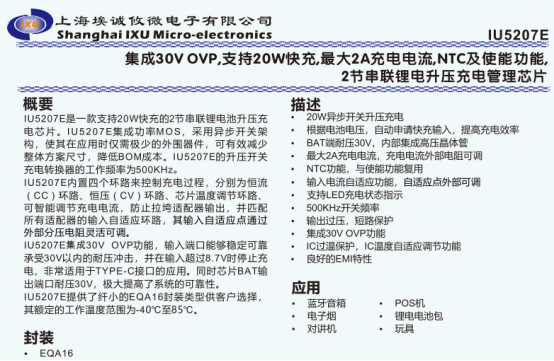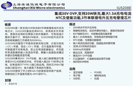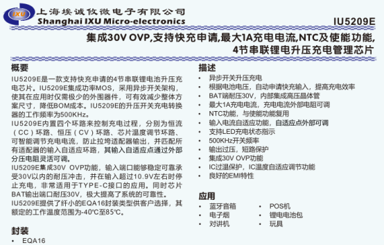 上海埃诚攸微电子推出 IU5207E、IU5208E、IU5209E三款锂电升压充电芯片,精准覆盖 2-4 节串联锂电池应用需求。三款芯片均集成 30V OVP(过压保护)功能,输入端口可稳定承受 30V 以内耐压冲击,适配 TYPE-C 接口场景(TYPE-C口的电压不稳定),同时 BAT 输出端口同样耐压 30V,大幅提升系统可靠性。