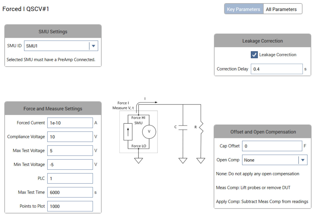 Force-I QSCV测试的输入参数显示在Clarius的“配置”视图中,如图3所示。用户设置最大和最小测试电压、输出电流和时序参数。开路补偿和泄漏校准为可选功能,也可以在 “配置” 视图中应用。