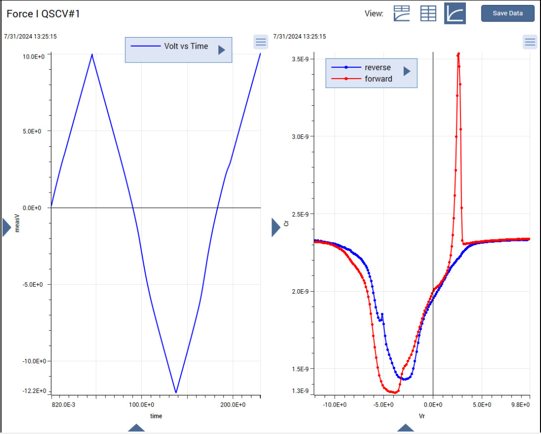 “分析” 视图图形将显示测量结果。电压随时间的测量值将实时显示在左侧图形中,电压测量完成后,正向和反向C-V扫描将显示在右侧图形中。