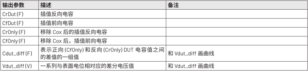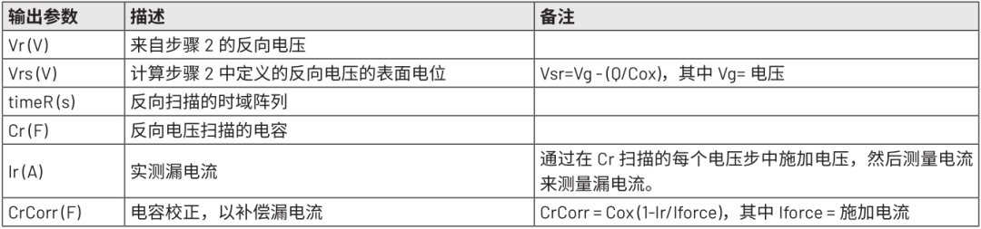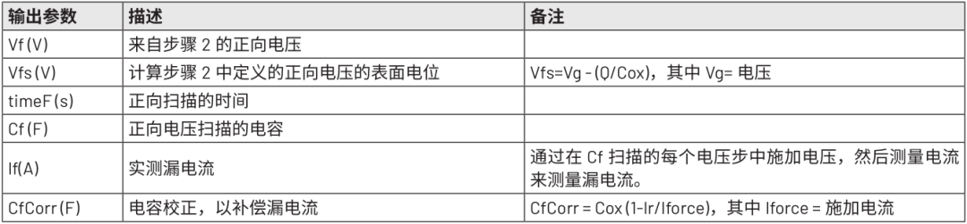 数据被拆分为反向和正向C-V扫描,以准确表示测量结果。对于反向扫描,输出反向电压 (Vr)、反向扫描时间(timeR) 和反向电容 (Cr)。在正向扫描中,输出反向电压(Vf)、正向扫描时间 (timeF) 和电容 (Cf)。