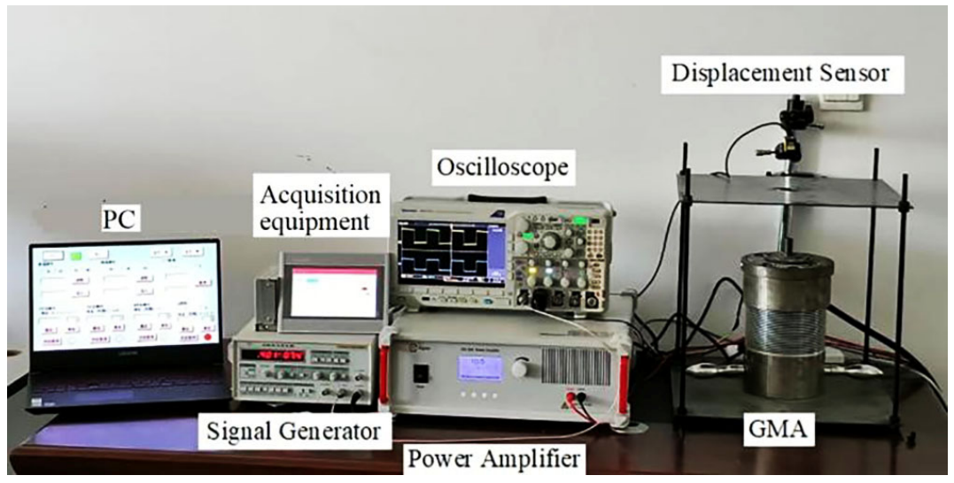 实验过程:信号发生器产生正弦交流信号,经ATA-309功率放大器放大后驱动超磁致伸缩执行器振动。激光位移传感器、示波器、数据采集卡及显示设备与PC配合,完成数据的显示、采集、处理及后续分析。