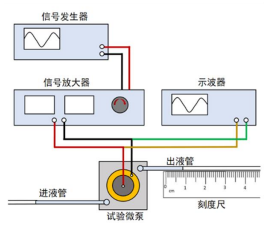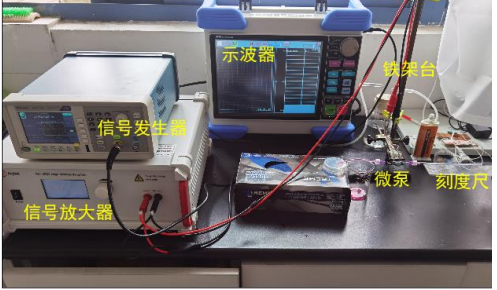 实验过程:微泵的正弦输入信号由信号发生器产生,并由信号放大器进行适当放大,其中信号放大器用于调节信号的幅值大小,信号发生器可用于控制信号的频率值;示波器用于实时监测输入信号的波形是否符合预期。