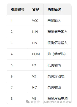 JSM21867STR 采用与 IRS21867 相同的 SOP-8 封装,引脚定义与功能一一对应:1 脚 VCC(电源)、2 脚 HIN(高侧输入)、3 脚 LIN(低侧输入)、4 脚 COM(地)、5 脚 LO(低侧输出)、6 脚 VS(高侧浮动地)、7 脚 HO(高侧输出)、8 脚 VB(高侧浮动电源)。无需修改 PCB 布局即可直接替换,完美继承原有设计成果。