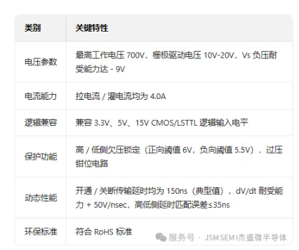 作为一款专为高压功率场景设计的驱动芯片,JSM21867STR 的参数表堪称 “教科书级别”。它支持最高 700V 工作电压,浮地通道设计让其轻松应对高压母线环境,无论是驱动 N 沟道高压 MOSFET 还是 IGBT,都能稳定输出驱动力。