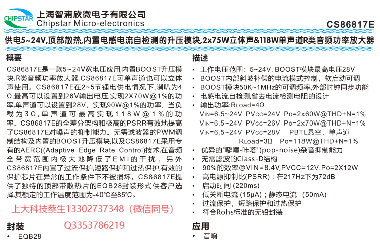 做音频硬件开发,是不是总被供电适配、功率不足、杂音干扰这些问题卡脖子?上海智浦欣微电子的 CS86817E R 类音频功率放大器,直接把这些痛点全解决,参数硬核还好用,咱直接上干货!