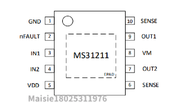 MS31211 是一款低压、大电流、单全桥驱动。它可应用于低电压及电池供电的运动控制场合,并且内置电荷泵来提供内部功率 NMOS 所需的栅驱动电压。MS31211 可以提供最高 3.2A 的峰值电流,其功率电源供电范围从 1.8V 到 10V,逻辑电源供电范围从1.8V 到 6V。两个输入脚可以控制直流电机工作在正转、反转、刹车以及滑行模式。全桥由 IN1/IN2 逻辑控制,并且当所有的 INx=0V 超过 3ms 时,进入待机模式。