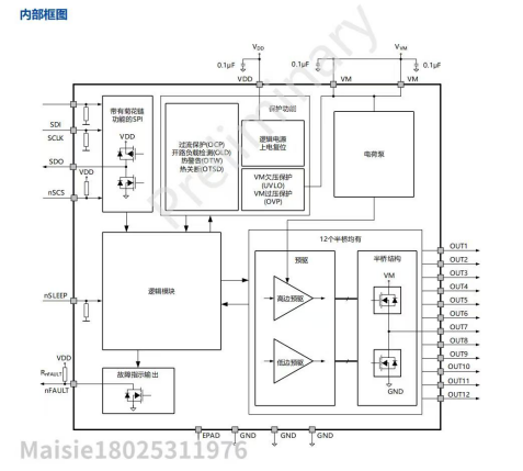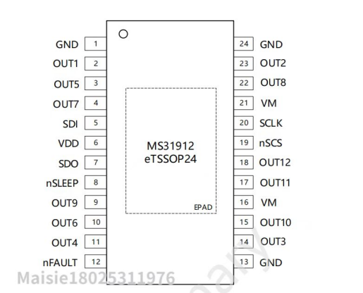 MS31912 是集成多种高级诊断功能的多通道半桥驱动。MS31912 具有 12 个半桥,典型工作电压 13.5V 下,每一个半桥支持 1A 电流,典型工作电压 13.5V 以上,每一个半桥支持 0.5A 电流,并联模式下支持最大 6A 电流。并且每一个半桥是完全可控的,以实现电机的正转、反转、滑行和制动操作。该驱动器还支持 5MHz 串行外设接口(SPI),并且具备菊花链功能,可进行完整的配置和详细的诊断。该驱动器内部具有 4 个 PWM 发生器,可通过寄存器映射到任何半桥,并选择每个通道的 PWM 频率以及占空比。此外,该驱动器还具备多种诊断和保护功能,包括欠压保护、过压保护、过流保护、开路负载检测(OLD)、过温保护。