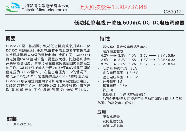CS5517T(看 CS5517_ch_v1.0.pdf):输出电压能从 1.2V 调到 5V,适合要低压输出的设备;3.3V 输出时,就算输入只有 1.8V,也能出 0.3A 电流,比如双节干电池快没电的时候也能用;功率管(HS/LS)内阻 300mΩ(VIN=3.6V、IL=0.1A 时),输入输出电容选 10μF 以上就行。