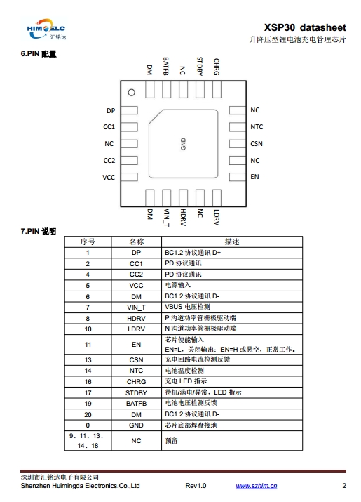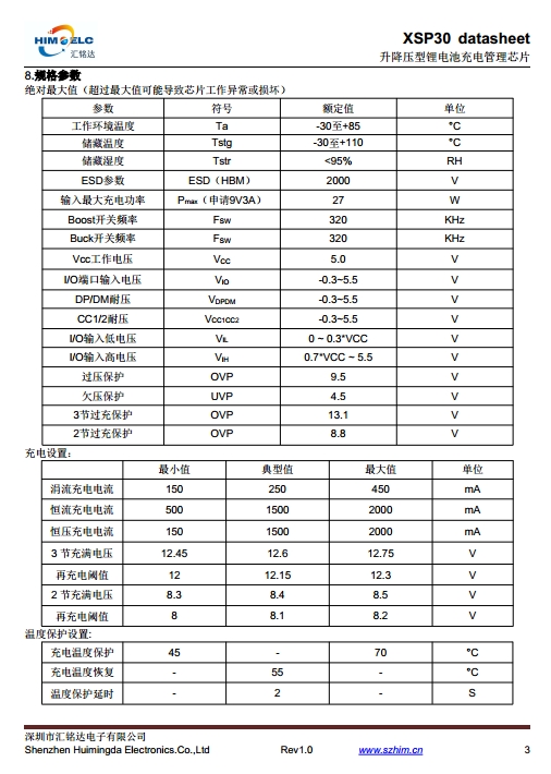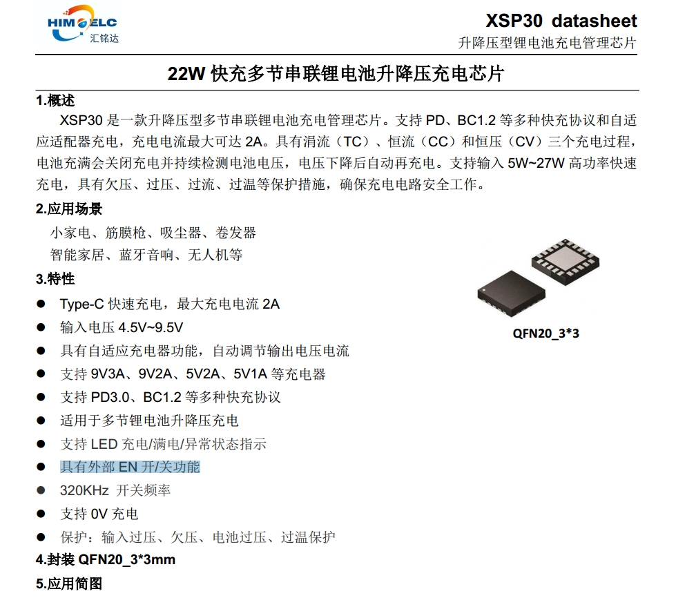 XSP30 是一款升降压型多节串联锂电池充电管理芯片。支持 PD、BC1.2 等多种快充协议和自适应适配器充电,充电电流最大可达 2A。具有涓流(TC)、恒流(CC) 和恒压(CV)三个充电过程,电池充满会关闭充电并持续检测电池电压,电压下降后自动再充电。 支持输入 5W~27W 高功率快速 充电,具有欠压、过压、过流、过温等保护措施,确保充电电路安全工作
