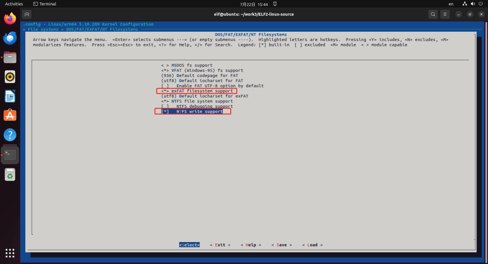 在弹出的内核配置界面中,导航至DOS/FAT/EXFAT/NT Filesystems菜单,勾选以下选项: