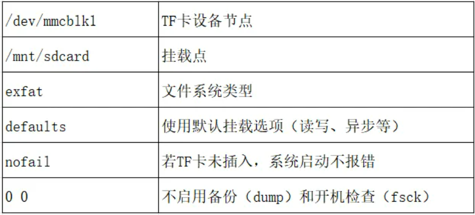 创建exfat_fs目录作为exFAT格式TF卡的挂载点,-t exfat指定文件系统类型为exFAT,将dev/mmcblk1挂载到exfat_fs/。