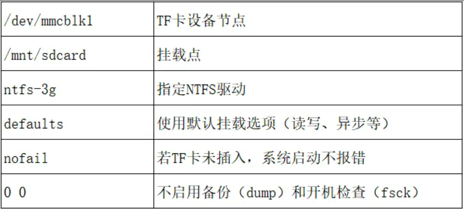 创建ntfs_fs目录作为NTFS格式TF卡的挂载点,-t ntfs-3g指定使用ntfs-3g驱动挂载NTFS格式(Linux 下NTFS读写的常用驱动),将dev/mmcblk1挂载到ntfs_fs/。