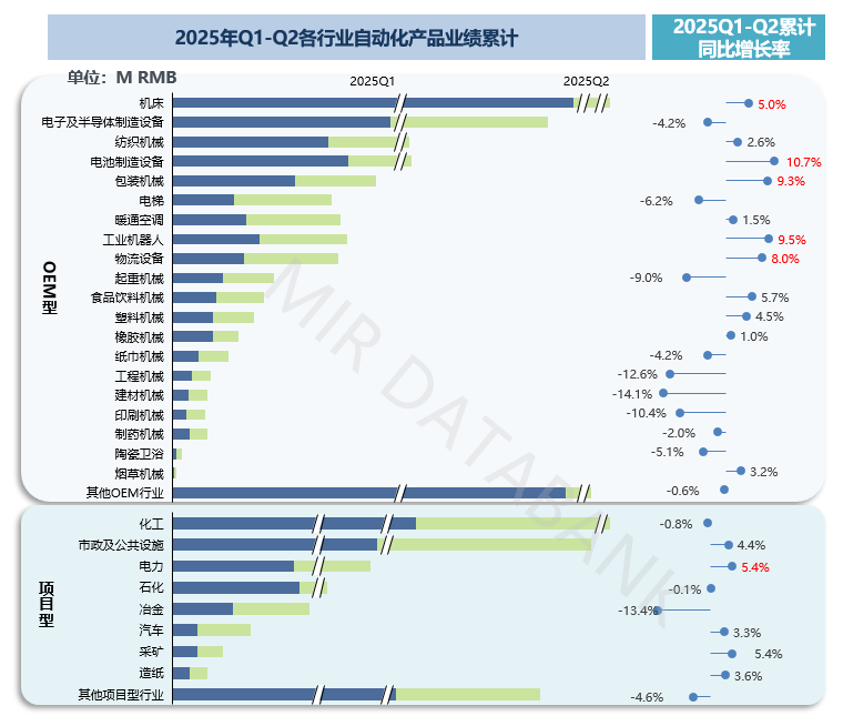 2025年上半年,关税战对中国自动化市场产生的影响弱于预期,市场短暂性回暖。根据MIR DATABANK最新数据显示,中国自动化市场一季度同比增长2.4%,二季度同比下降1.5%。