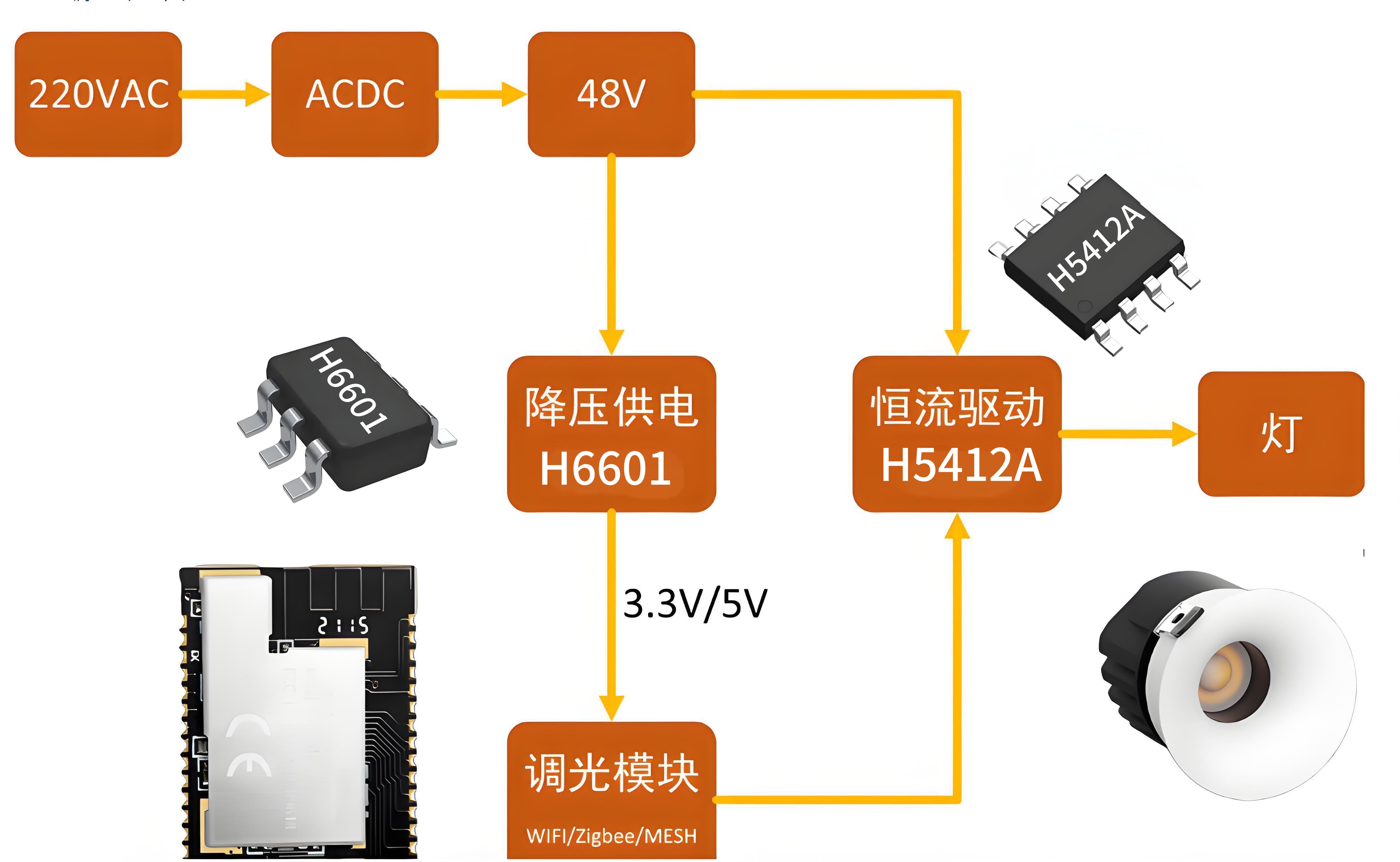以H6601 这类降压芯片为例(见下图,调光电源架构图),在电源架构中承担二次降压的任务:将AC220V家用电经过前级转换48V直流电再进一步降压至3.3V或者5V,为调光模块提供精准电能供给。