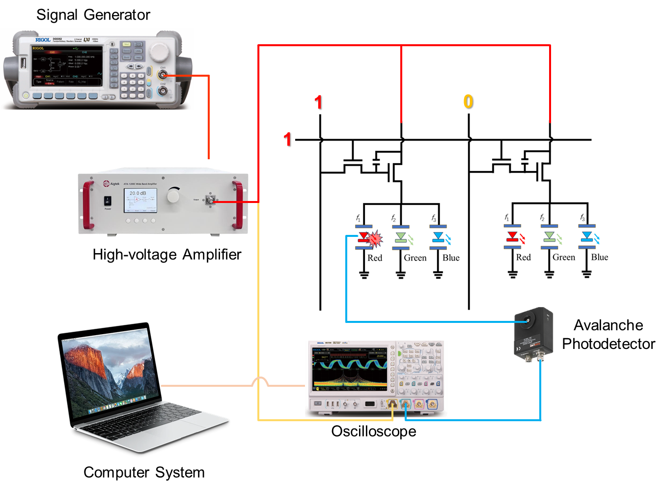 实验过程:构建器件理论模型以及驱动电路模型,通过信号发生器产生正弦信号,经ATA-122D放大器放大后,连接到驱动电路中。使用示波器检测输入电压,并通过光通量计和色度计测量器件的亮度。在不同驱动频率下进行测量,以确定不同结构LED的最佳工作频率,最终实验单信号线对多LED的驱动。
