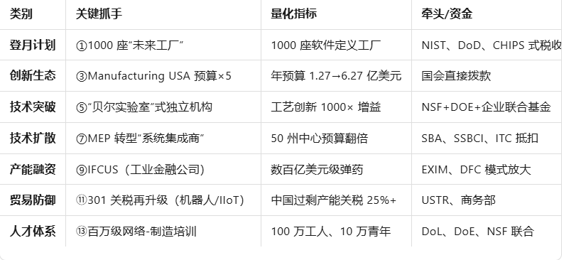 《美国先进制造业领导力国家行动计划》建议采取七大行动计划,旨在提升美国在先进制造领域的领导力,应对中国在工业领域的竞争,并强化国家安全与经济竞争力。以下是核心要点: