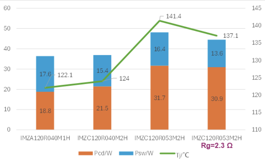 在这种应用情景下,34mΩ G2与40mΩ G1损耗与结温基本持平,如果换用40mΩ G2,结温会升高约8℃。但这种升高的结温可以用降低门极驱动电阻Rg来进行补偿。将Rg从4.7Ω降低到2.3Ω,40mΩ G2结温将会降低到139.4℃,与40mΩ G1非常接近。