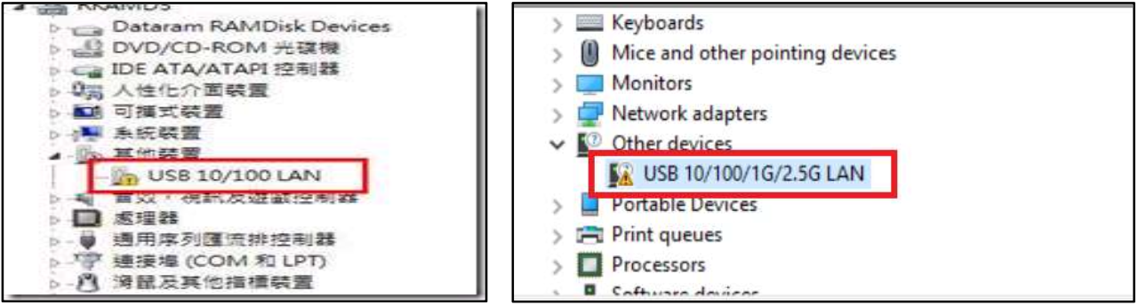 如果没有看到,请检查驱动程序是否正确安装,以及 USB LAN 的硬件是否正常。