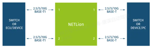 在标准 2.5/5/10GBASE-T 以太网信号(双向)中转换多达两个 2.5/5/10GBASE-T1 信号。