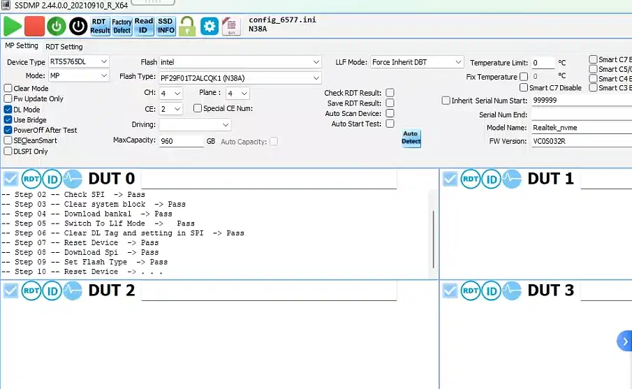 第4步:软件扫描到新设备后,点击界面顶部蓝色齿轮图标,把配置文件选择成“config_6577.ini”这种标准模板配置,即可激活“Auto Detect”按钮(有的软件已被锁定无法更改设置,需要点击界面顶部绿色小锁图标,输入密码“realtekssd”即可解锁)。然后点一下“Auto Detect”自动检测和匹配闪存型号,检测完成后,在软件左上方点绿色三角图标进行开卡。耐心等待一段时间,即可完成开卡。