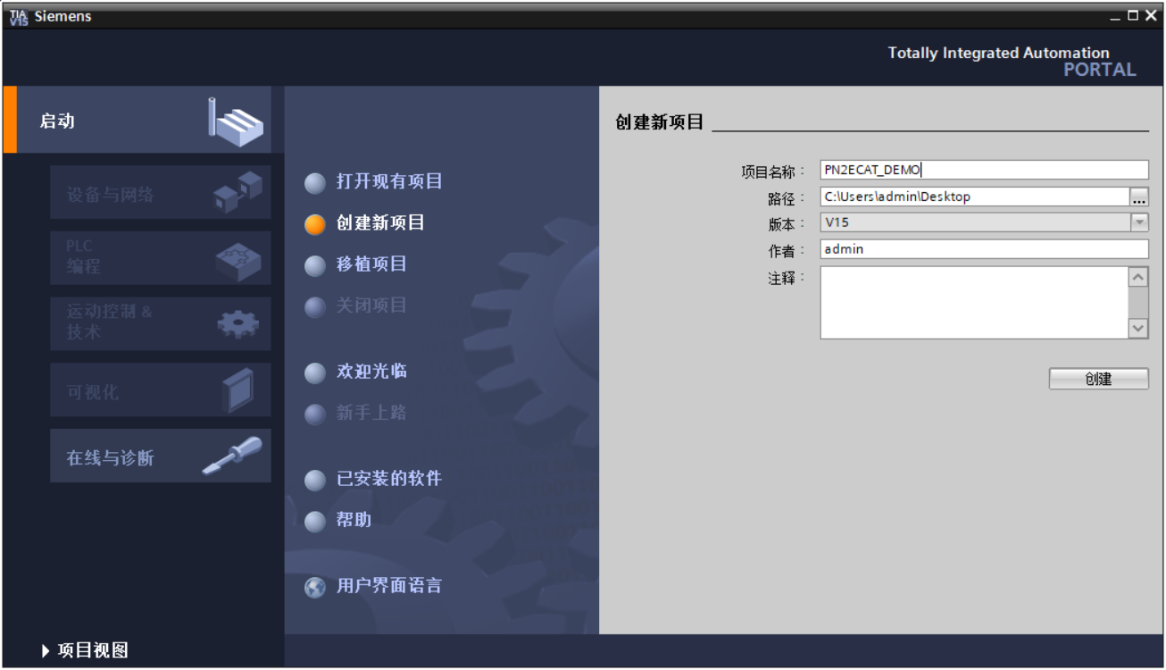 打开TIA Portal,选择创建新项目,输入项目名称,选择路径等信息后,点击创建,如下图所示。