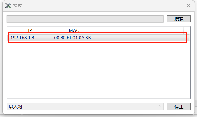 也可通过下方的“搜索”按钮扫描从站设备,点击“搜索”按钮弹出“搜索设备”对话框,第一步先点击“搜索”,等待扫描完成后,在下方空白处将显示扫描成功的HT1S-ECM-PNS网关设备,包括IP、MAC以及固件版本等信息,双击该显示信息返回“Connect Dialog”界面点击“OK”按钮,如下图所示: