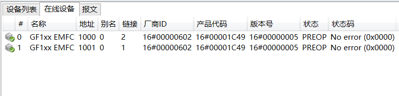 点击“是”将扫描整个EtherCAT网络内的从站设备,扫描完成后EtherCAT网络从站设备信息在<从站信息面板→在线设备>选项卡显示,详细内容查阅“在线设备”选项卡功能介绍,如下图所示:
