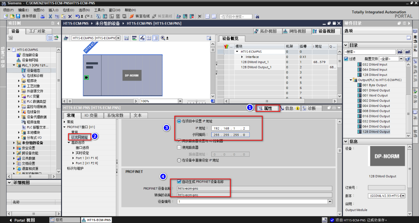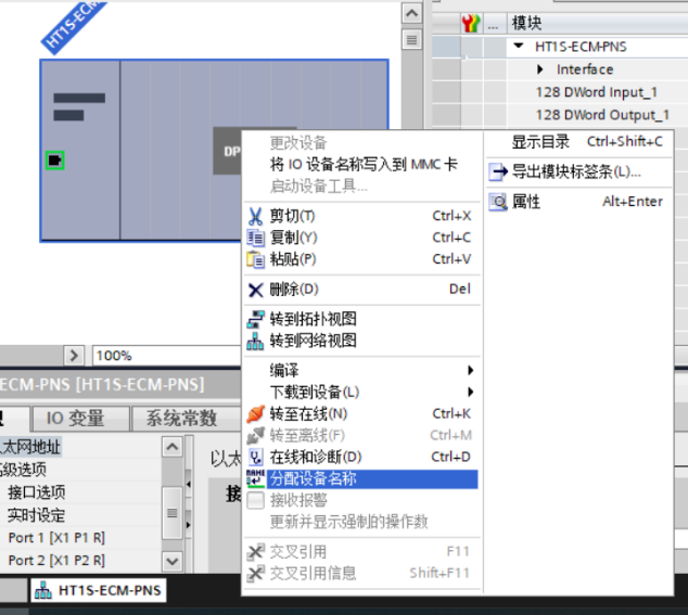 在“设备视图”选择HT1S-ECM-PNS,右击鼠标选中“分配设备名称”;