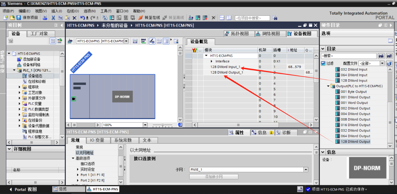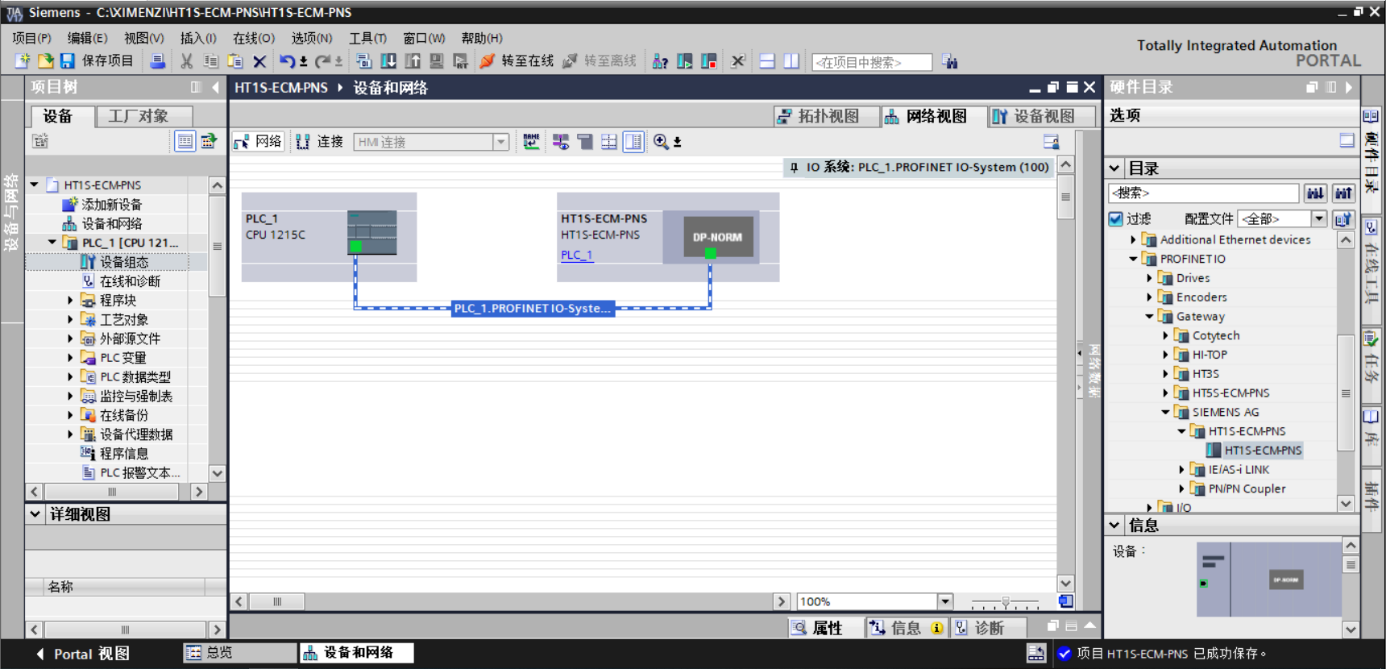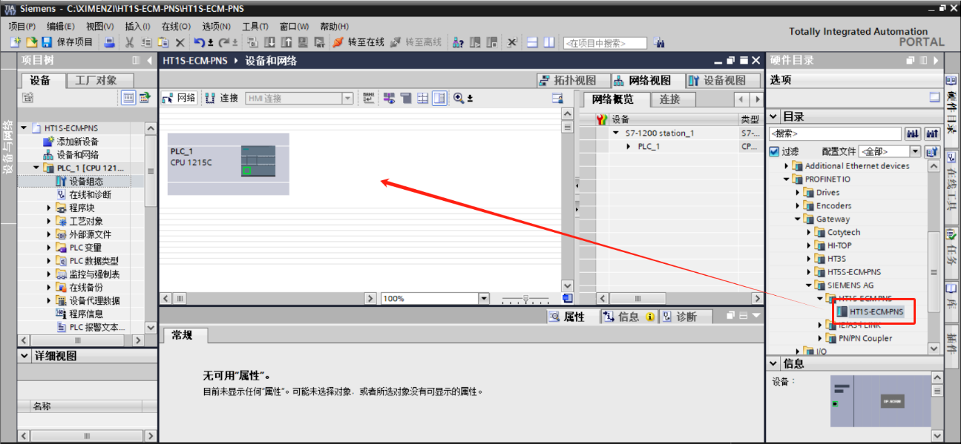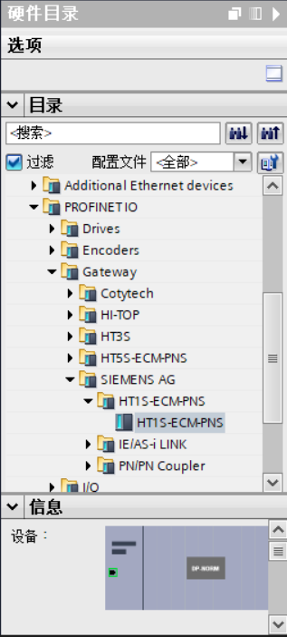 双击设备和网络,添加HT1S-ECM-PNS设备模块,在硬件目录 > 其他现场设备> PROFINET IO > Gateway > SIEMENS AG > HT1S-ECM-PNS > HT1S-ECM-PNS,如下图所示: