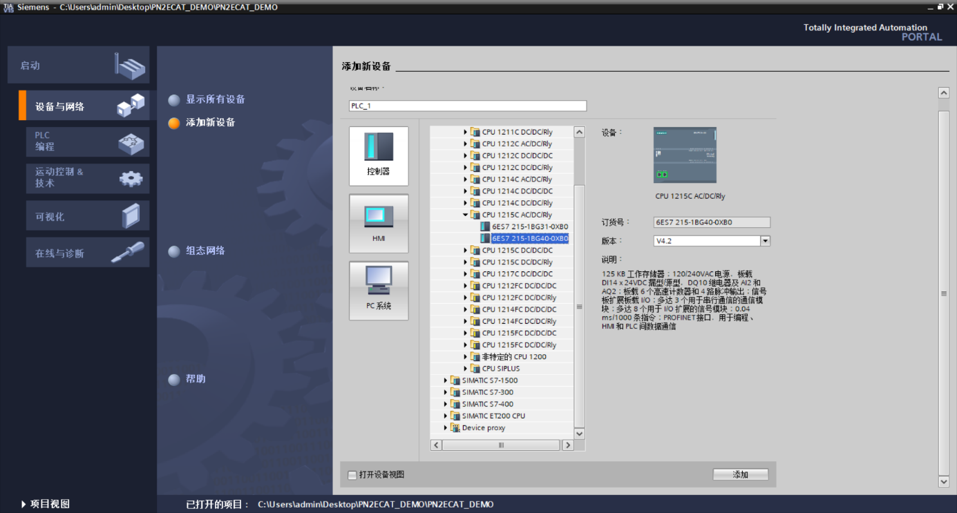 在视图中,选择“设备和网络”并单击“添加新设备”(或者在项目视图中的项目名称下,双击“添加新设备”),如下图“添加新设备”对话框,添加支持PROFINET接口的控制器,例如6ES7 25-1BG40-0XB0。