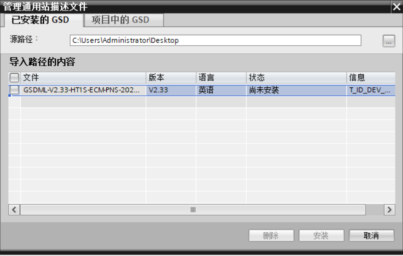 在弹出的对话框中,选择“已安装的GSD”选项卡,点击源路径选择按钮,弹出浏览文件夹对话框中找到选择 GSD文件“GSDML-V2.33-HT1S-ECM-PNS-20210807”所在的文件夹路径并选中,点击确认即可。