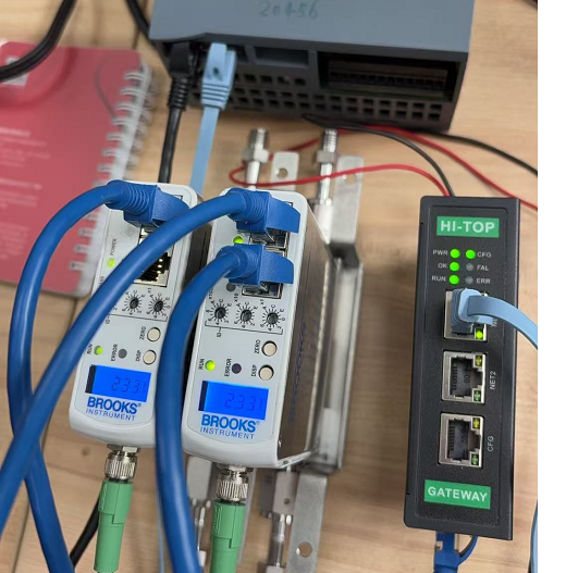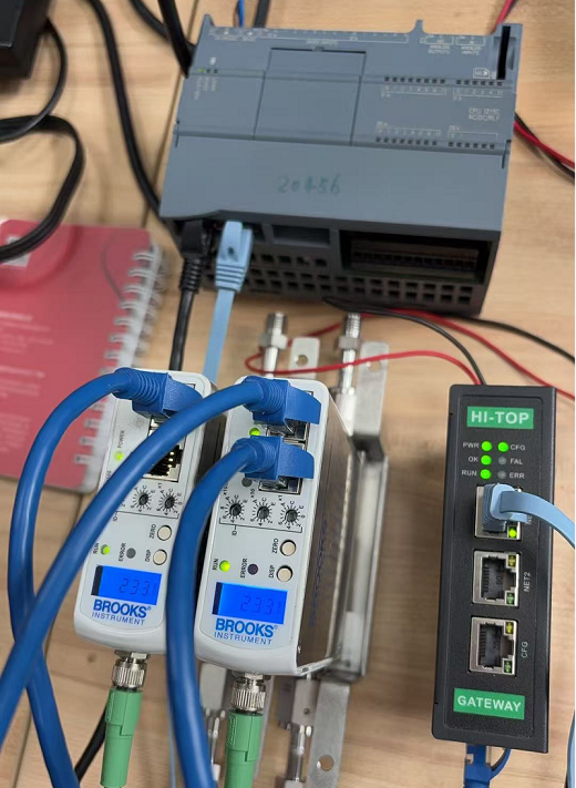 解决方法:使用1台HI-TOP的EtherCAT主站网关 HT1S-ECM-PNS,2台流量计支持EtherCAT协议,1200 PLC支持Profinet协议, HI-TOP的EtherCAT主站网关 HT1S-ECM-PNS可以采集多个BROOKS的EtherCAT流量计接入西门子PLC的Profinet网络进行数据传输。以下为测试环境: