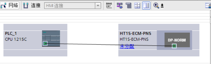 选择“网络视图”以显示要连接的设备。选择HT1S-ECM-PNS的PROFINET端口,然后将连接拖到PLC_1模块的PROFINET端口处,释放鼠标按钮以创建网络连接。