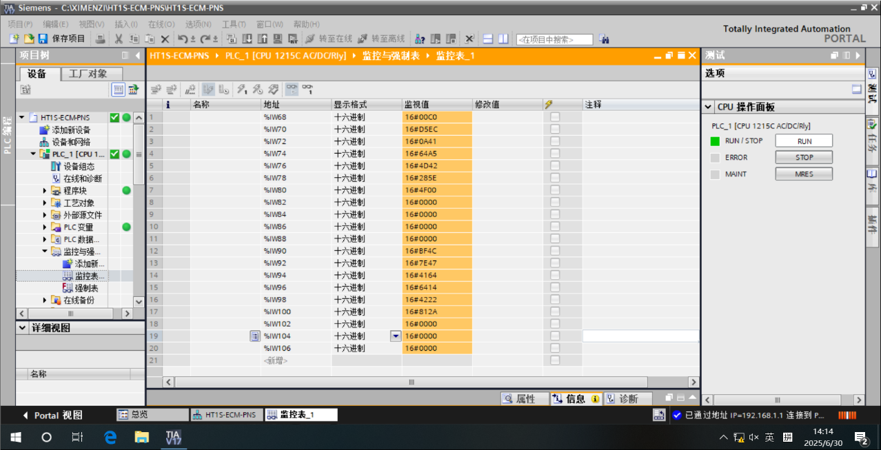 PLC编程软件创建监控表,添加地址进行监控,并换到监控器模式,如下图所示:
