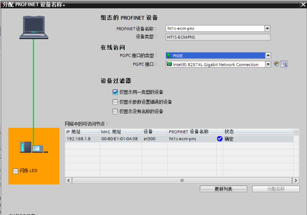 弹出“分配PROFINET设备名称”对话框,在“网络中的可访问节点”下点击更新列表(HT1S-ECM-PNS若干设备正确连接在网络里)即可访问出PROFINET网络里的各个节点;选中更新列表的节点,点击“分配名称”将组态的PROFINET设备名称:HT1S-ECM-PNS写入网络节点中;写入成功后PROFINET设备名称更新为“HT1S-ECM-PNS”,状态为“正确”;关闭该对话框;重启网关后设备名称有效。