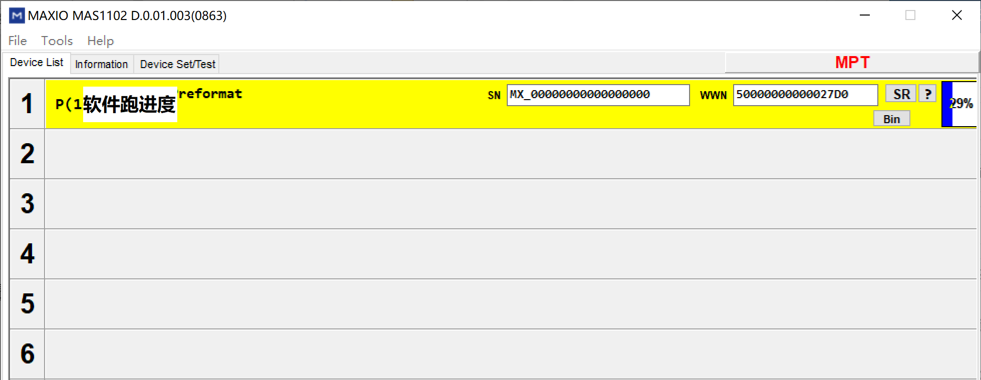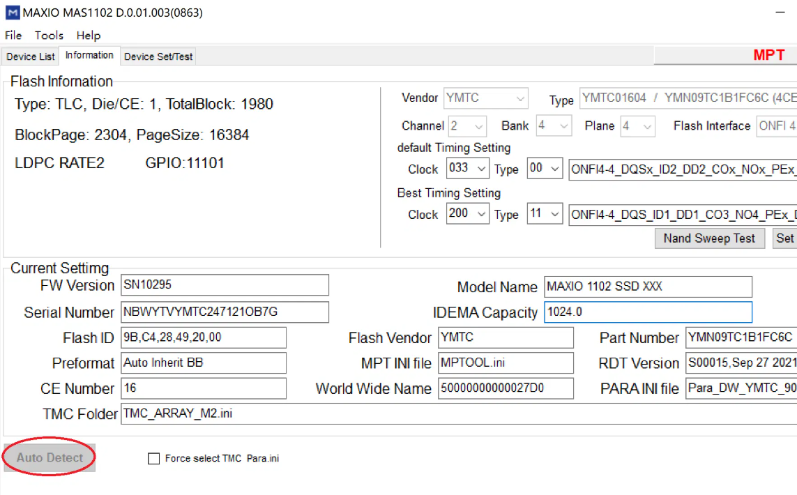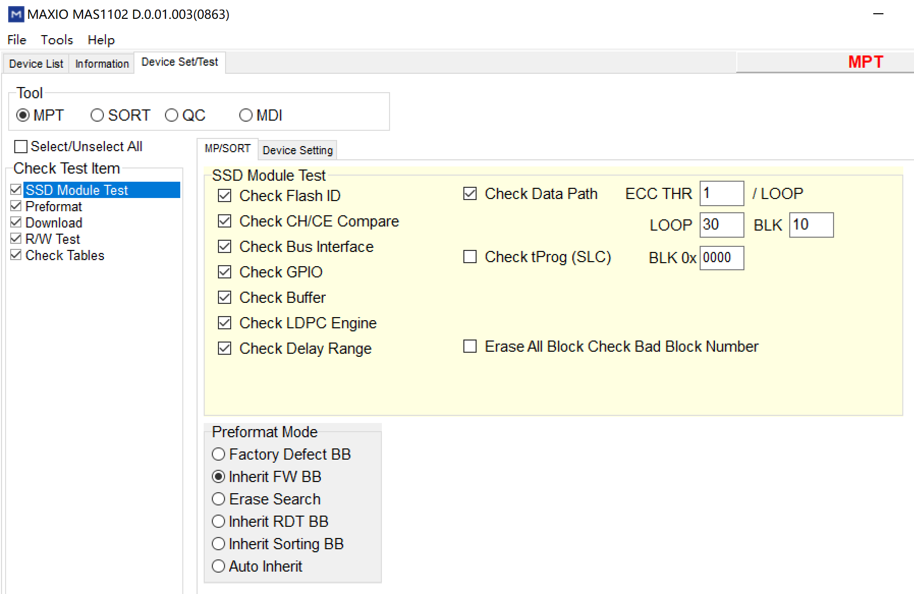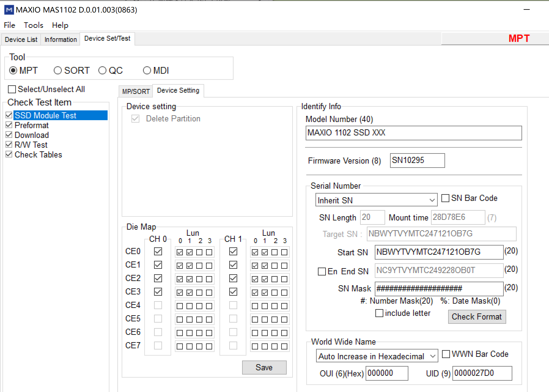 接着在Device Set/Test栏目中选择MPT,在子栏目MP/SORT中的Preformat Mode选择Auto Inherit或者Inherit FW BB,在子栏目Device Setting中填写型号和序列号,即Model Number和Serial Number。Device Set/Test栏目的这些设置可以自己摸索更改,多研究一下也很有意思。