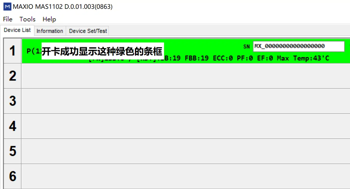先打开开卡软件,然后用金属镊子(细铁丝、细铜线都行)连接SSD PCB板上的两个ROM孔不要松开,把SSD连同转接板一起插在电脑的USB接口上,在Device List栏目中认盘后会显示黄色条框,此时就可以拿开镊子了。如果ROM孔一直连接着会导致开卡失败。