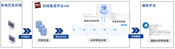 当流水线产生故障日志时,在大量日志中人工排查定位根因如同“大海捞针”。AI+PET方案能通过从海量非结构化日志中提取关键信息,自动关联代码提交记录、测试报告等数据,分析故障日志原因,帮助快速定位问题根源。
