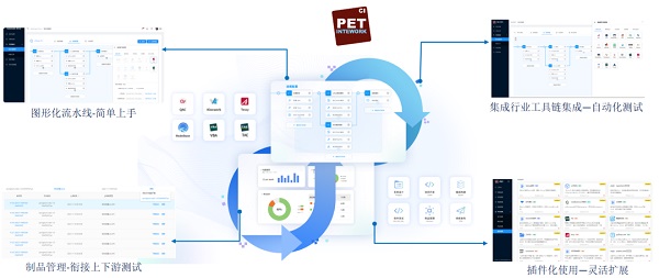 这些痛点如同隐形的枷锁,严重影响着车企的研发效率。在此背景下,经纬恒润基于多年汽车软件研发领域的技术沉淀,推出“AI驱动的智能CI/CD全栈解决方案”。该方案以经纬恒润自研的汽车软件CI/CD平台INTEWORK-PET为技术底座,通过融合AI大模型使汽车软件研发流程更加自动化和智能化。PET平台在传统持续集成基础上深化了研运一体化(DevOps)的概念,高效地将嵌入式软件研发涉及到的ALM平台、仓库、模型/代码、软件集成、编译构建、HIL测试、版本管理以及发布等环节打通,实现从研发到交付的全流程自动化,是针对汽车行业的DevOps平台。