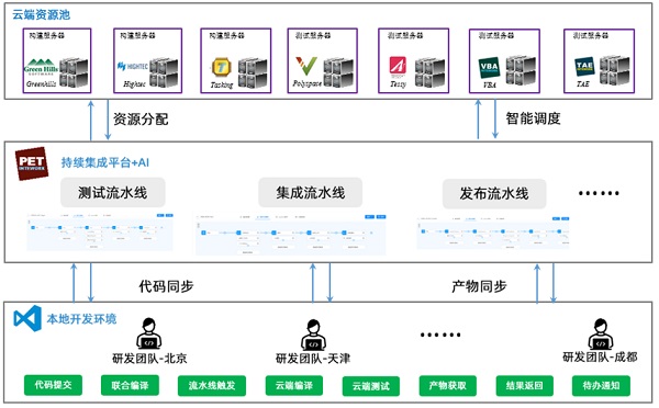 传统CI/CD流水线中,资源分配依赖CI/CD引擎的随机分配策略,往往出现“关键任务等资源、闲置资源无人用”的窘境。AI+PET方案的智能调度系统通过实时分析任务优先级、历史执行时长、硬件负载等数据,动态调整资源分配策略。当检测到大规模仿真测试、大量消耗资源的编译任务或大范围、多规则集的代码静态扫描任务时,会自动选用硬件资源配置高的服务器,而对于小型功能模块的集成和测试任务,则智能分配轻量计算节点,提高资源利用率。