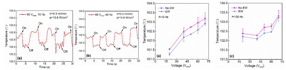 通过PLC继电器设计每5s施加介电电压,然后断开5s,并以此规律周期作用。当施加介电电压50V后,在第一个周期,壁面温度迅速从疏水壁面的102.8℃降低到亲水壁面的102.4℃;当关闭介电电压,壁面温度又迅速上升到102.8℃。在后面几个周期,均观察到在介电电压作用下壁面温度迅速下降,关闭电压,壁面又迅速上升。当介电电压为60v时,也观察到类似现象。实验结果表明,在微通道内流动沸腾条件下,通过交流电压电润湿效应对壁面温度有冷却的作用,且温度响应变化非常迅速。电润湿作用使汽液界面在毫秒级时间内发生明显周期性振荡。汽液界面振荡使汽泡干涸区域被周期性润湿,从而降低了壁面温度。发现由功率放大器施加的驱动电压越大,壁面温度的减少越明显,但频率对壁面温度的减少不明显。