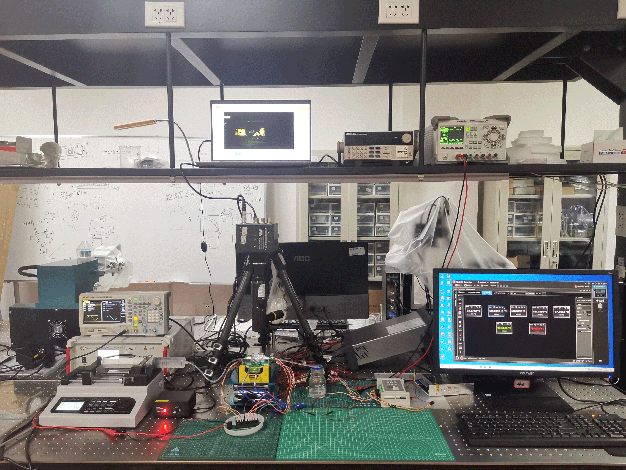 实验过程:以去离子水为工质介质,通过注射泵推动去离子水进入测试微通道。流体在测试段中吸收由直流电源提供的壁面加热热量后由单相液体到沸腾相变流体,并经微通道出口流入流体收集器。介电驱动电压由信号发生器提供并经功率放大器(Aigtek,ATA-2081)输出(电压:0-360v,频率,0-2kHz)。通过PLC对驱动电极阵列顺序供电,可控制微通道内气-液界面振荡。