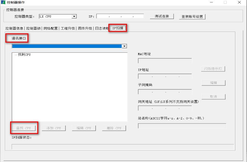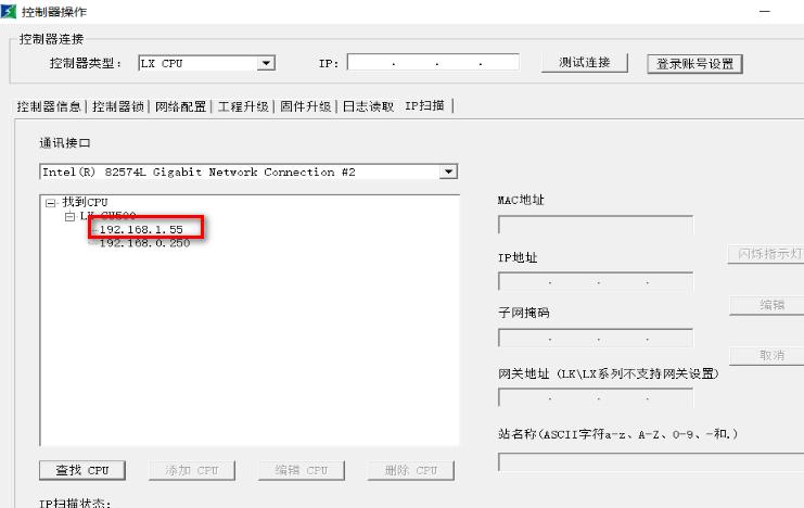 在 “工具—辅助工具” 打开控制器操作,进入界面点击“IP扫描”选择网卡进行查找CPU控制器。
