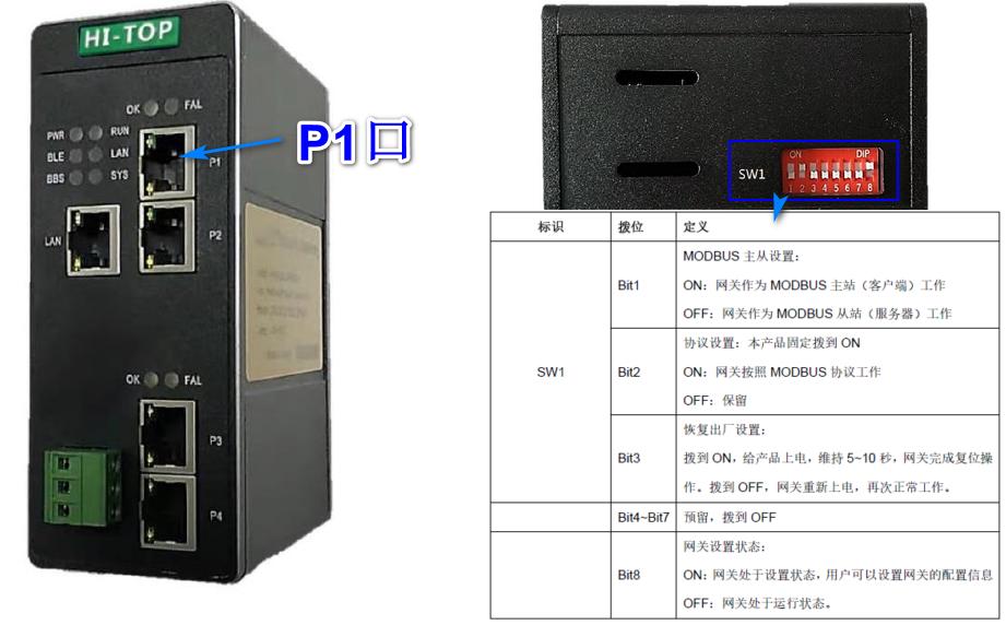 使用GW Modbus Builder连接到HT3S-ECS-MTP网关的P1口,并把拨码第8位拨到ON,如下图所示。此时网关P1口地址为:192.168.1.100。
