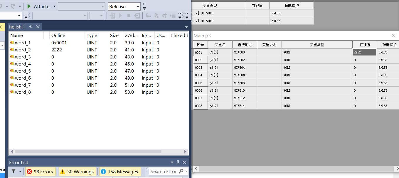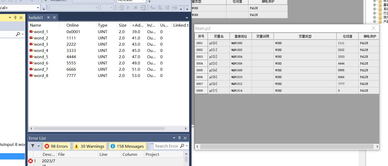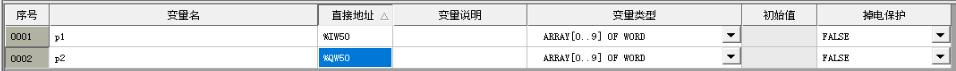 此处测试就添加%iw50和%qw50,变量类型选择ARRAY[0..9] OF WORD