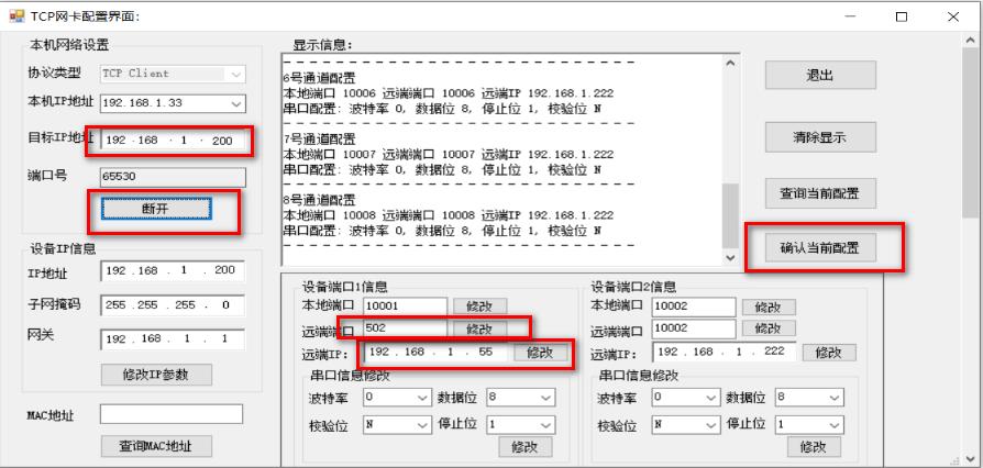 4.这里设置端口1的参数为利时LX-CU500PLC的网络参数,地址:192.168.1.55,远端端口:502。每改一个地方都要点击后面的“修改”按钮。