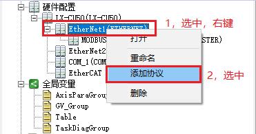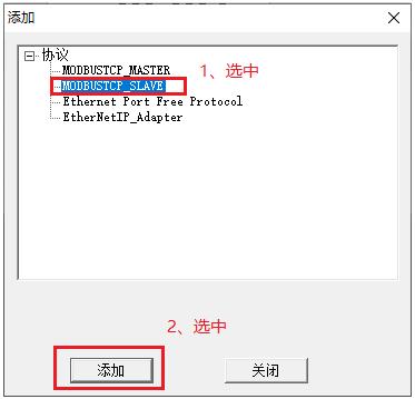 1.在【EtherNet1】节点的右键菜单中选择【添加协议】命令,弹出“添加”对话框,如图所示,选择MODBUSTCP_SLAVE从站协议。